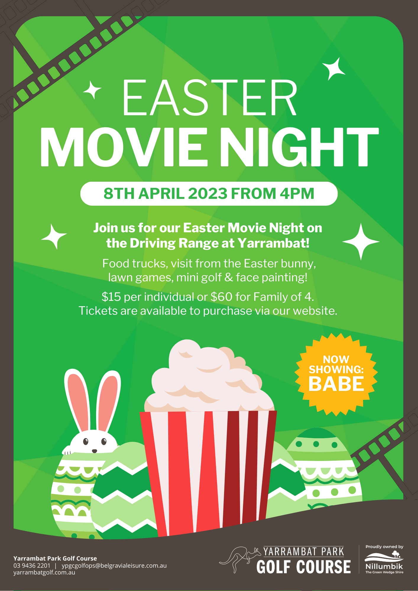 It's our favourite time of year at Yarrambat Park Golf Course! We love celebrating Easter and this year YOU are invited! Join us on Saturday 8 April from 4pm for our Easter Movie Night - a twilight night featuring the all time favourite movie "Babe"